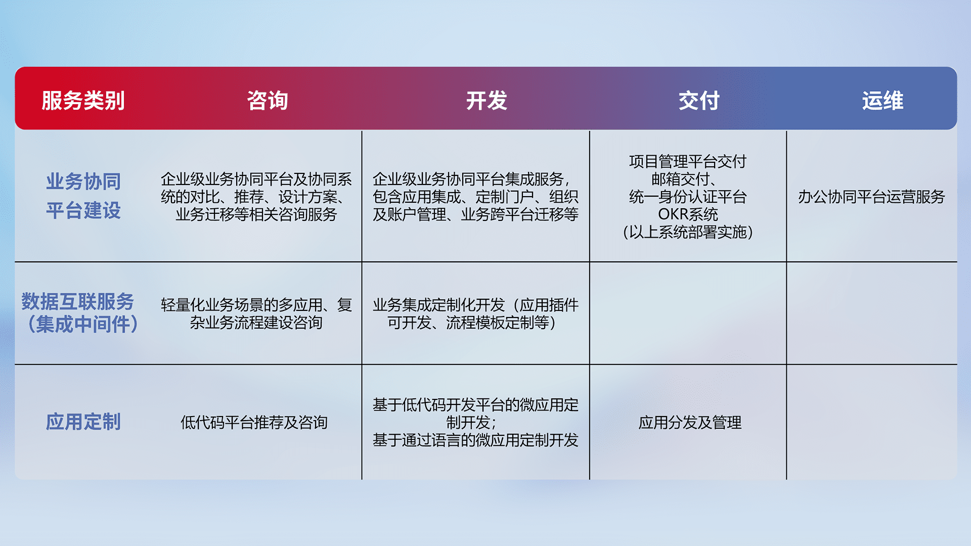 针对钉钉、、、、企微、、、IDaas等平台级产品提供产品的规划、、、方案、、、、交付、、、、定制化开发等服务,,,,实现如统一协同办公、、、智能客户服务、、、、混合会议管理、、智能数据查询、、、、等业务场景,,,实现数字化转型。。。。